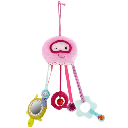 Au bout de ses tentacules sont attachés des hochets, anneau de dentition, miroir … pour stimuler l’éveil de bébé.
