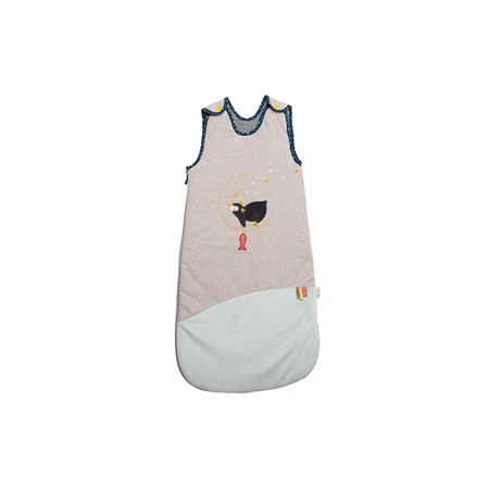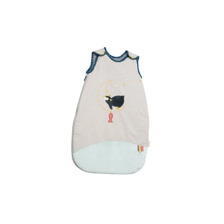 Ce sac nid de 90 cm avec sa fermeture éclair aide bébé à rester au chaud pendant l’hiver. L’intérieur est fait en coton avec des bretelles pour éviter au bébé de glisser. L’extérieur est décoré par des broderies de pingouin endormi avec son poisson rouge sur la lune. Le sac est lavable à 30° et ne doit pas passer au sèche-linge.